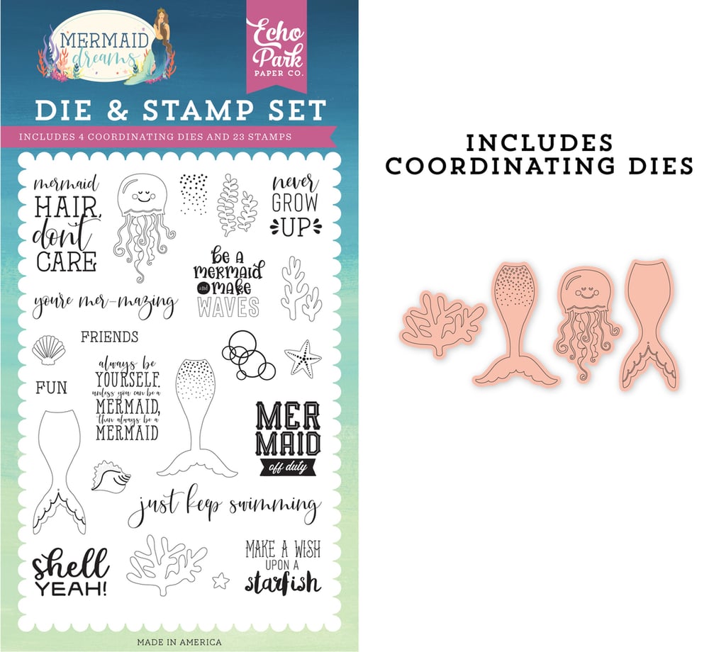 Mermaid Dreams Stamp & Die Set includes one 4" x 6" photopolymer stamp that includes 23 Stamps and 4 coordinating dies.