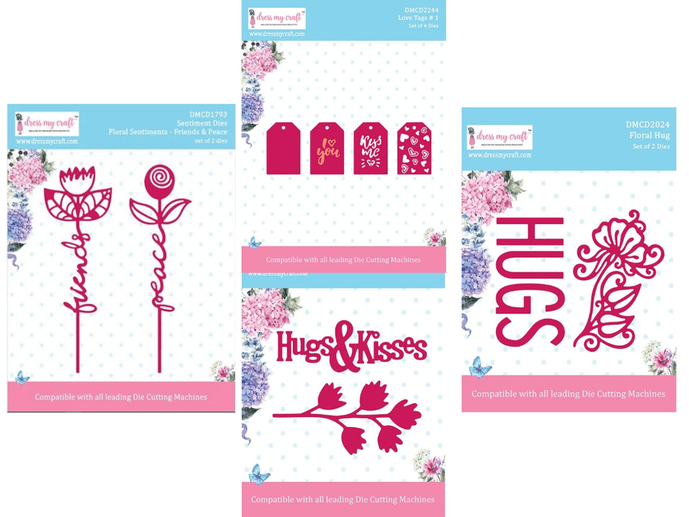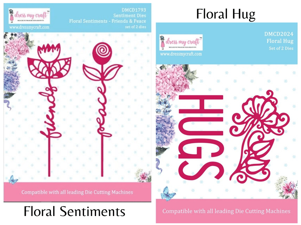 Send a hug to a friend with a handmade card embellished with the Floral Hug Dies by Dress My Craft. 2 thin metal dies Sentiment: 3" x 1.625" Flourish: 3.25" x 2"