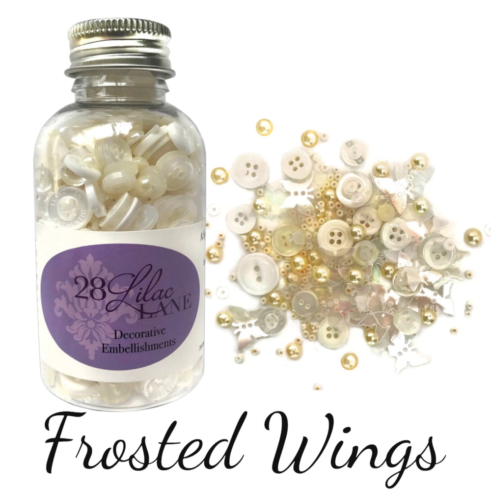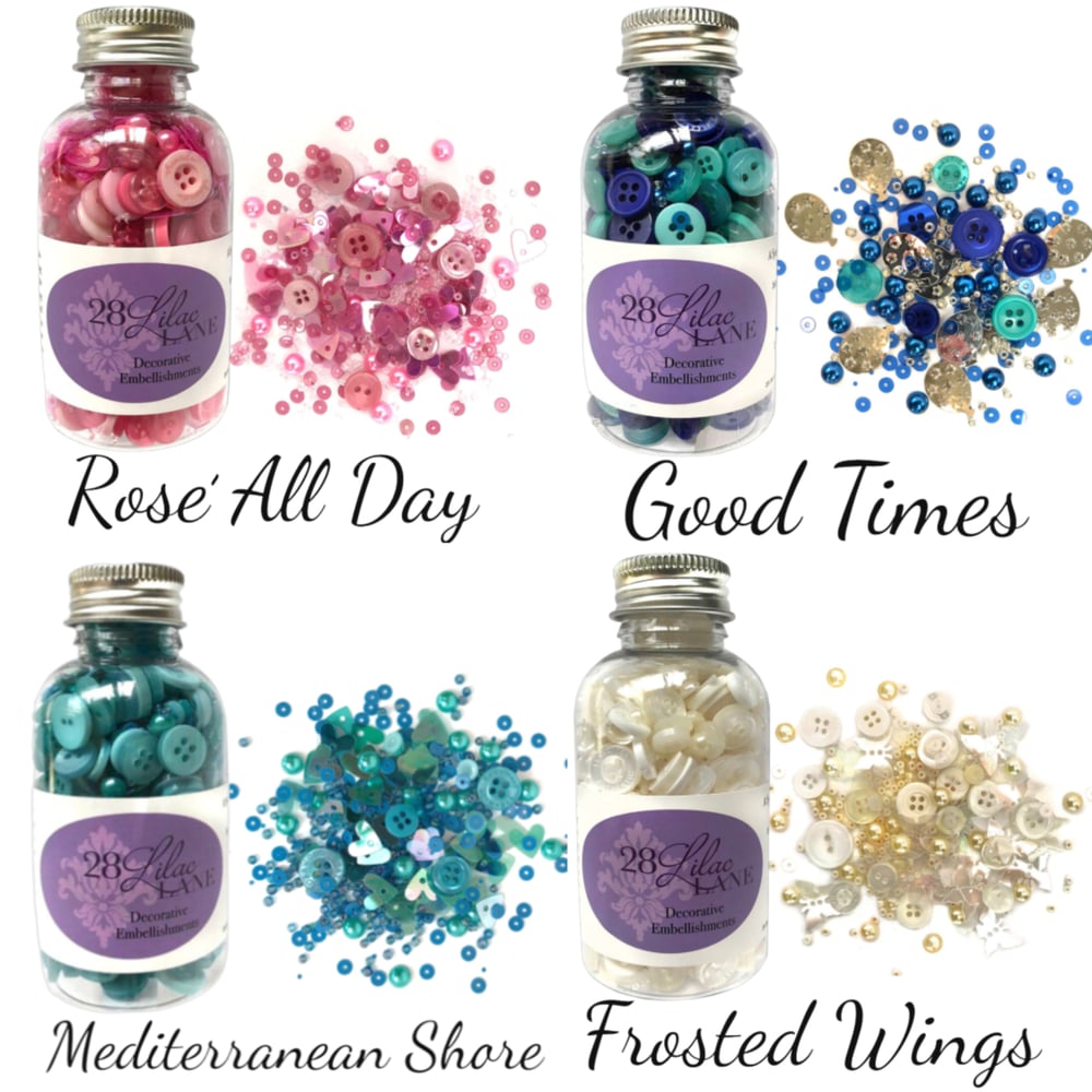 In each bottle you’ll l find a gorgeous mix of buttons, beads, sequins and shimmering flat back pearls. These embellishment mixes were created with a specific inspiration and color palette in mind that work charmingly together.